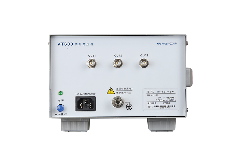 VT600的高壓輸入側(cè)in1,in2,in3分別連接被測端的L1, L2,L3。所有被測電壓具有相同的參考電位(大地)。 VT600可以測量隔離(非接地)電壓。因為VT600的接地可以把它們影射成對地電壓。 VT600的低壓二次側(cè)輸出端out1,out2,out3可以連接到高精度功率分析儀。